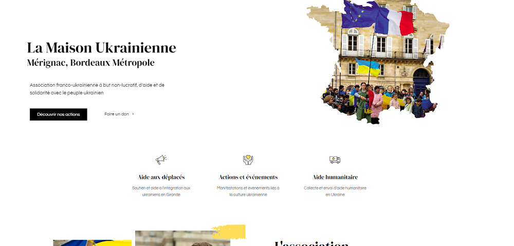 Nous avons terminé le développement de ce site en 2024 avec l'équipe de l'association ukrainienne La Maison Ukrainienne, qui opère dans la ville de Mérignac et dans la métropole de Bordeaux.